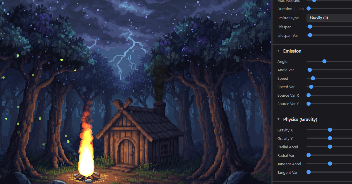 An interactive browser-based particle effect editor for Solar2D. Create, customize, and export particle emitters with real-time preview and built-in templates.